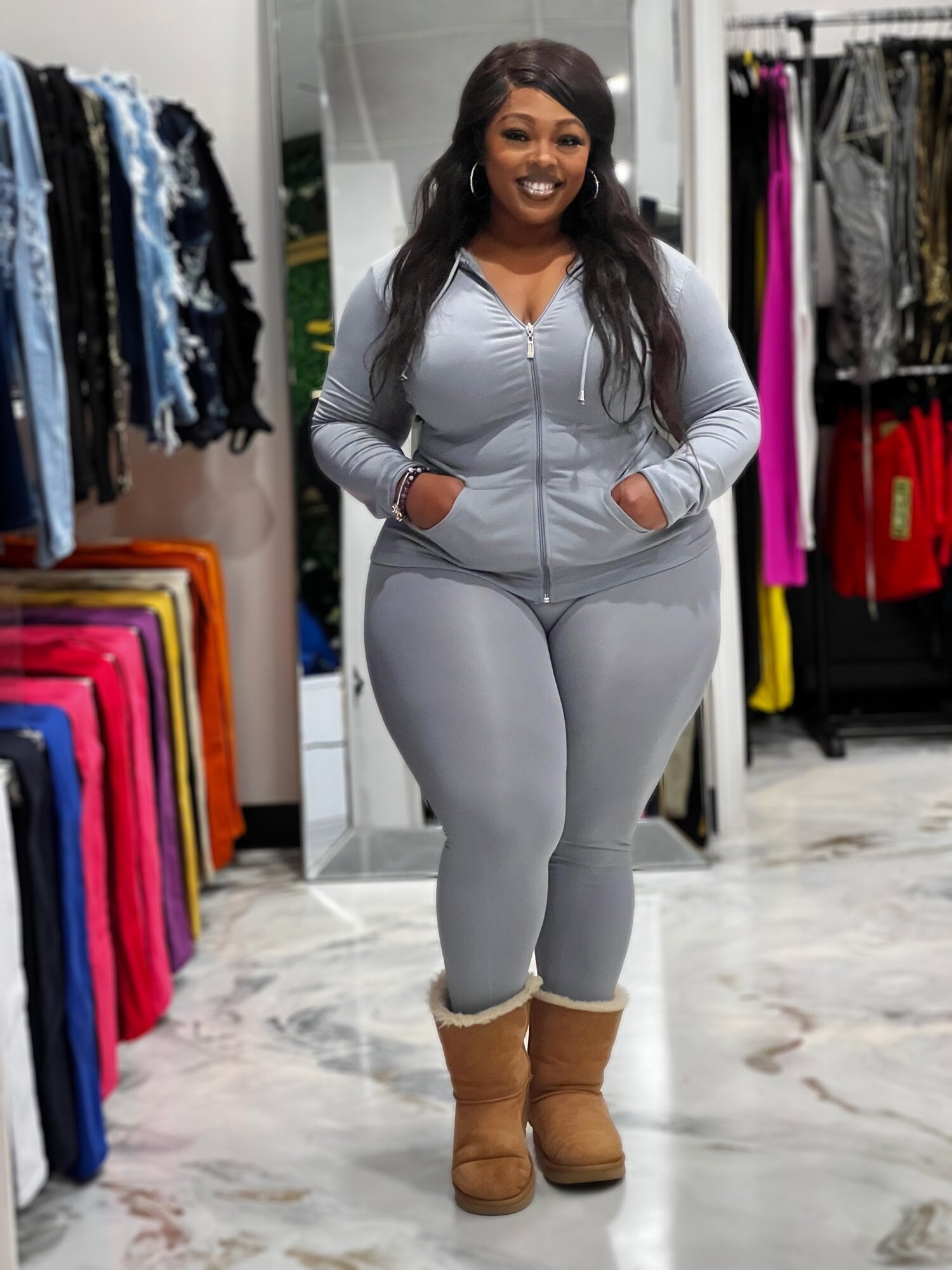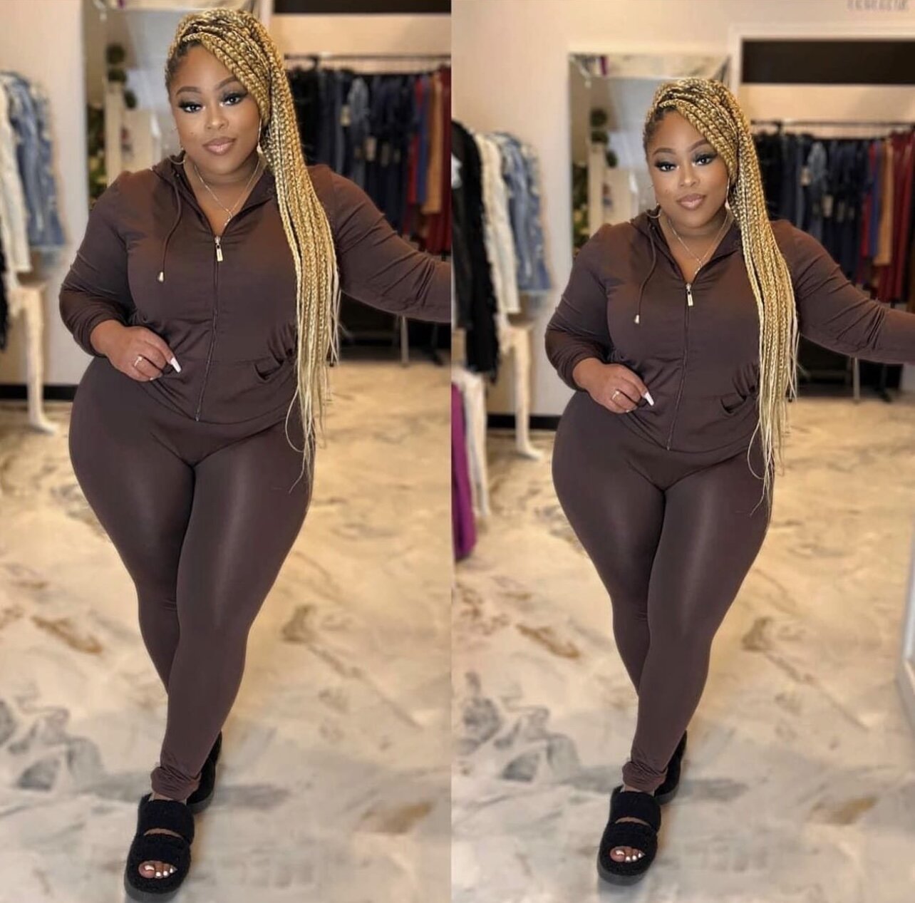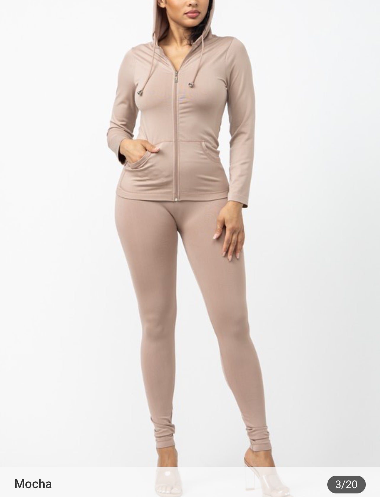 Seamless Zip Up Hoodie Drawstring Jacket With Side Pockets And Leggings Set Model: 5' 7, Bust 35, Waist 27, Hips 37.6