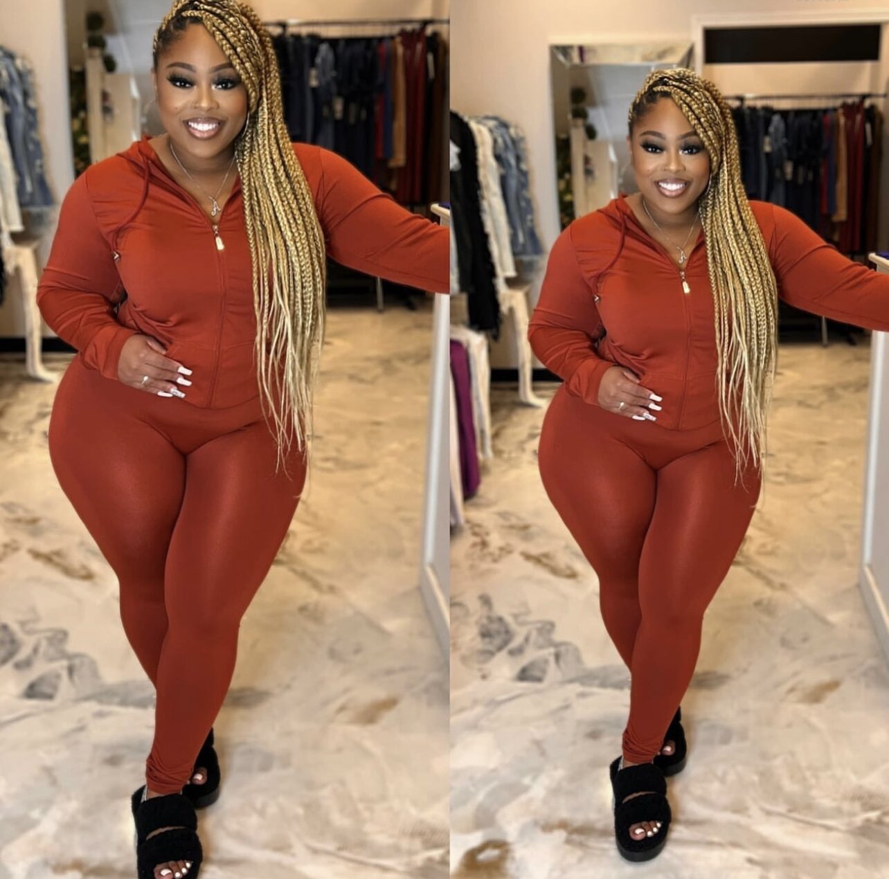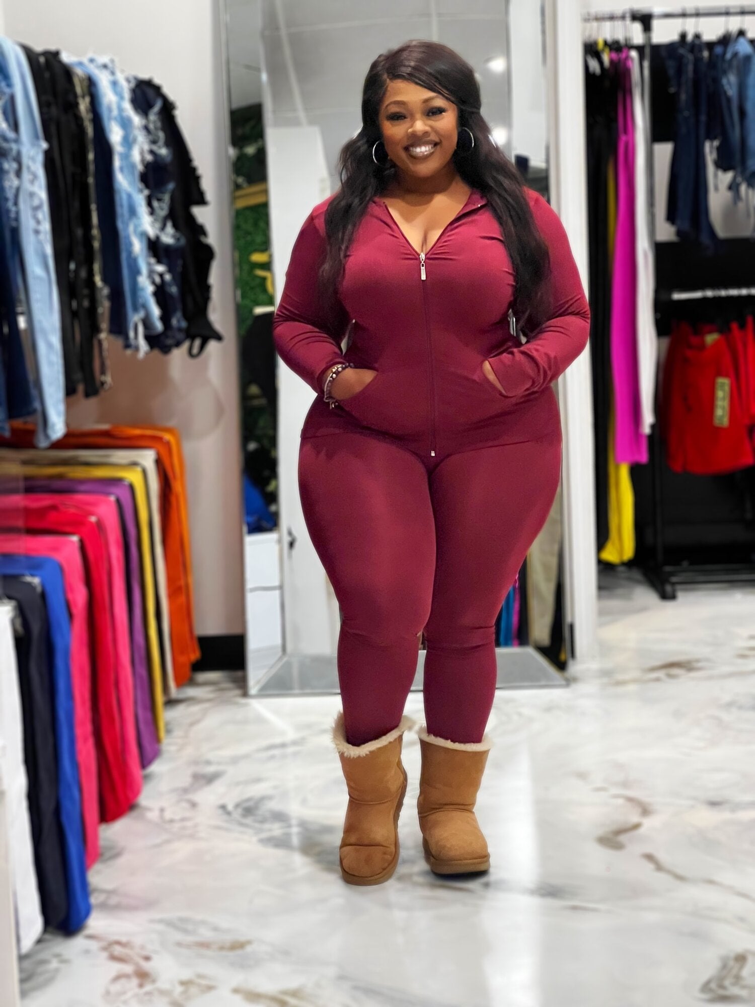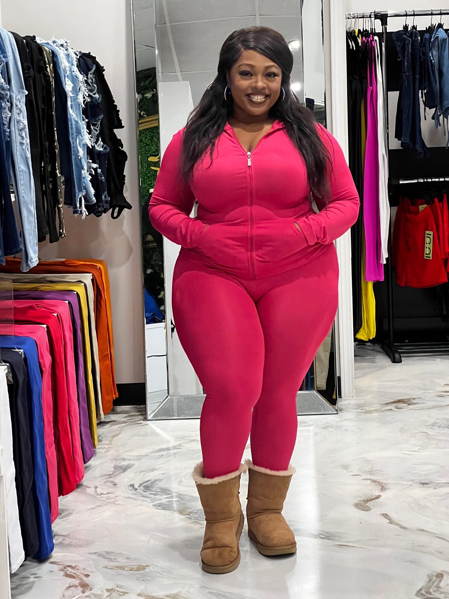 Seamless Zip Up Hoodie Drawstring Jacket With Side Pockets And Leggings Set Model: 5' 7, Bust 35, Waist 27, Hips 37.6